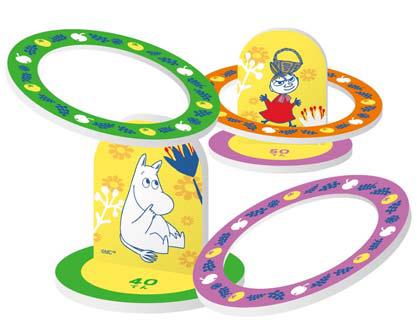 お花に囲まれた「ムーミン」たちの的をめがけて、木の実の輪っかを投げて遊ぶわなげ。