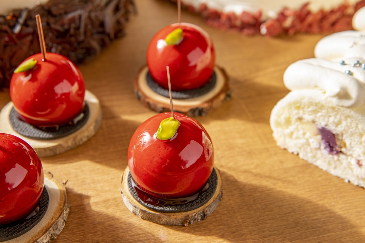 ドイツの伝統的なブラックフォレストケーキの上にキルシュを加えた甘いホワイトチョコレートムース、ホイップクリームやグリオットチェリーのオードヴィ漬けがふんだんにあしらわれた贅沢な逸品です。