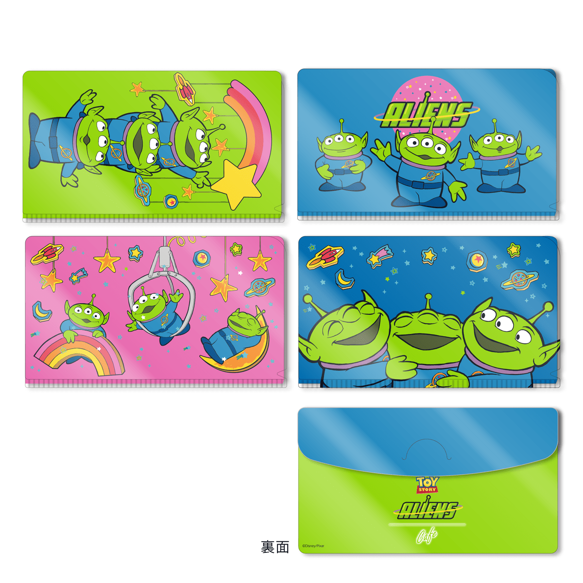 「エイリアン」たちのハートフルなアートがレイアウトされたクリアファイル。