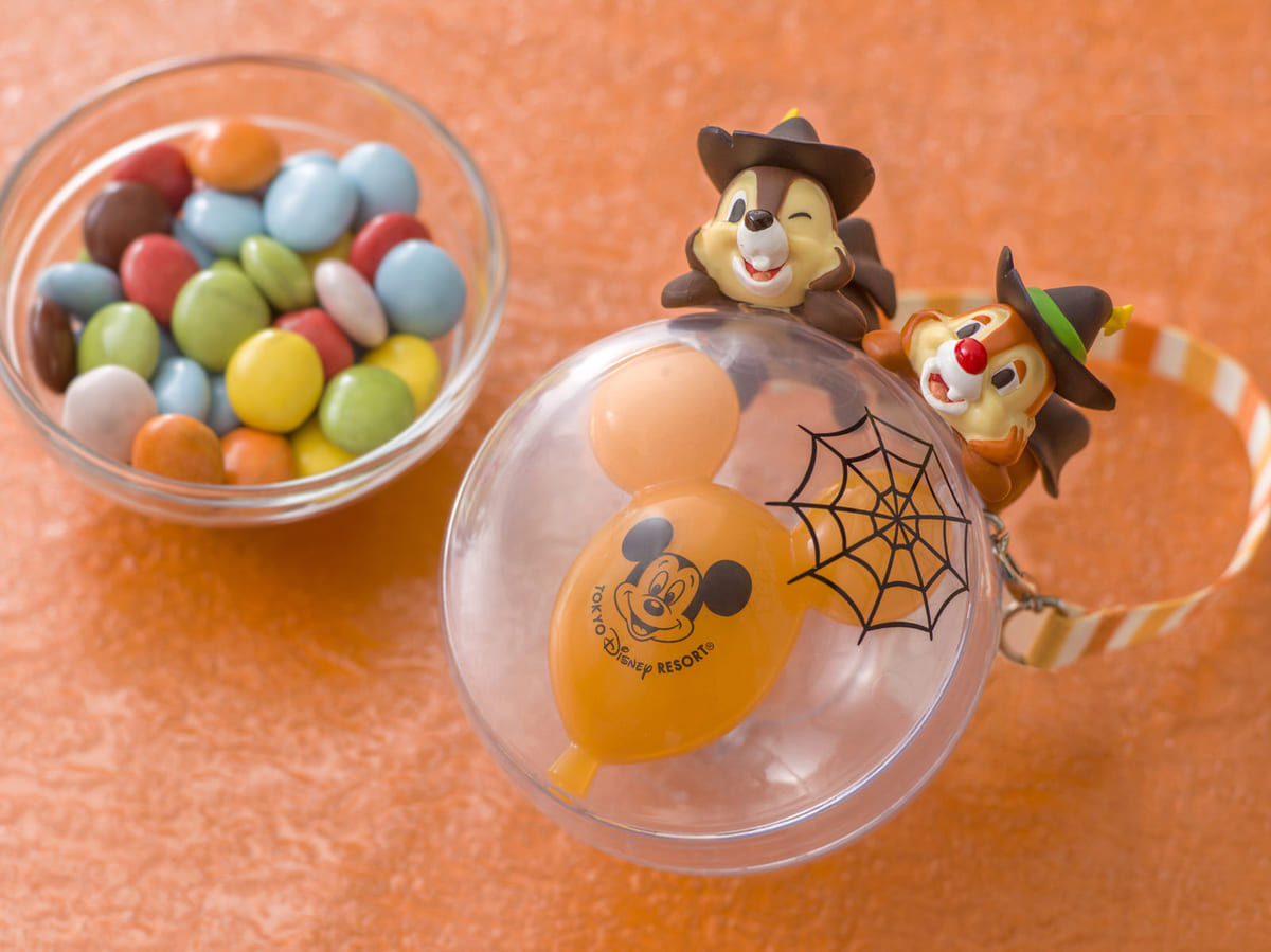 ハロウィーンのコスチュームをまとった「チップ&デール」がミッキーバルーンの上にのった姿がかわいいミニスナックケース。
