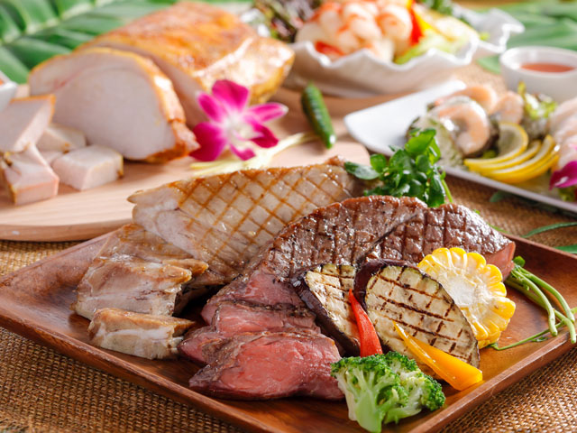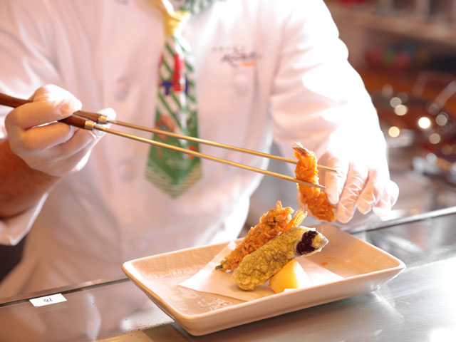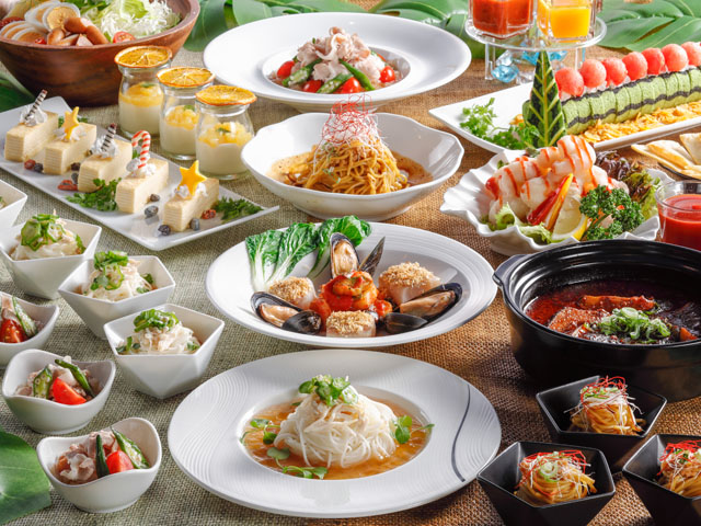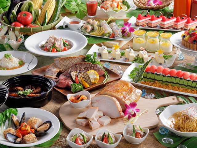 メニュー例:ビーフステーキの鉄板焼き、豚ロースのタンドリー風 大阪産(もん)なす入りラタトゥイユ、チキンハラミと野菜のガーリックソテー、エビフリッターのトマトチリソース、ピリ辛麻婆茄子、冷製汁なし担々麺、エビの生春巻き スイートチリソース、フルーツカクテルの彩りゼリー、スイカロールケーキ、フランボワーズのムース、バターあんトッツォ 等