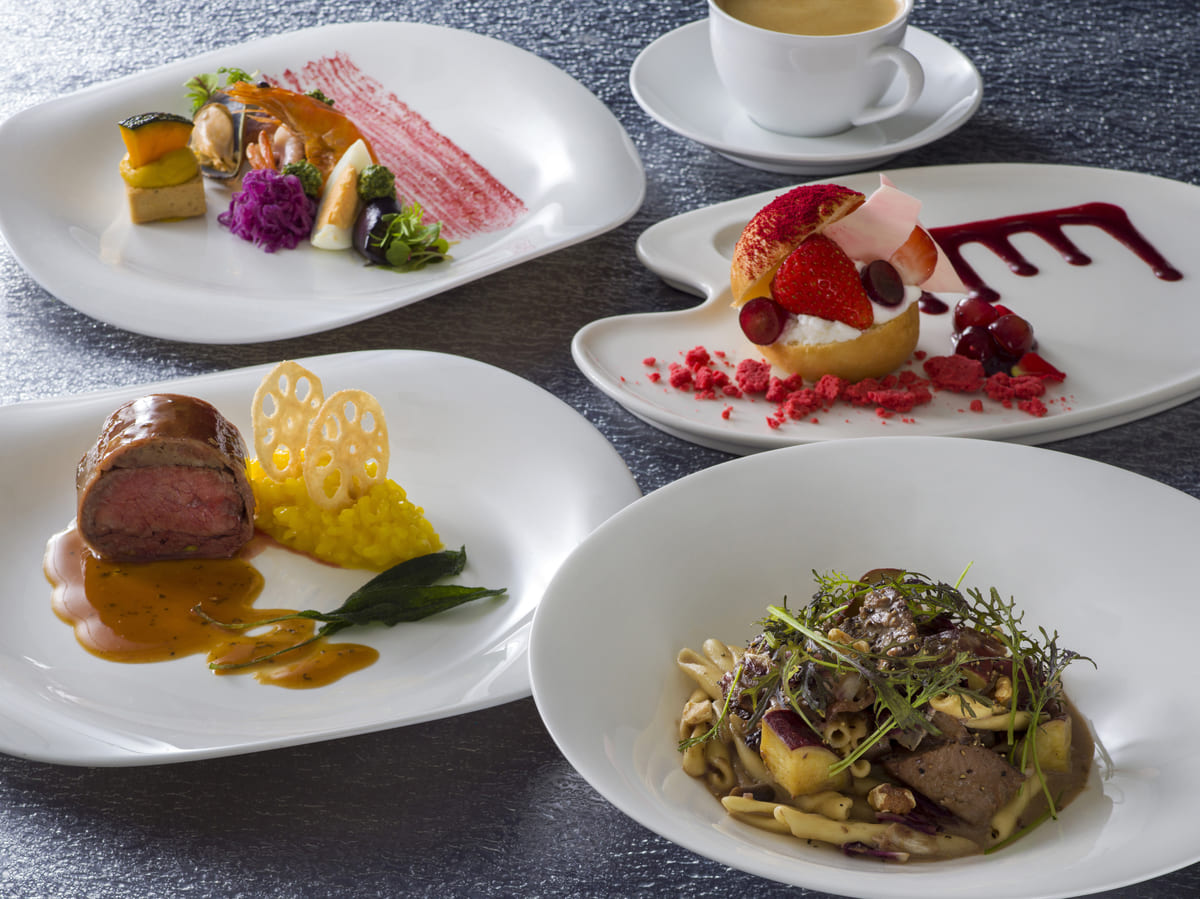 シーフードのサラダとハロウィーンらしい食材のカボチャを用いたタルトを合わせた前菜、マグロのほほ肉ときのこを具材に、赤ワイン入りのクリームソースでコクのある味わいに仕上げたパスタなど、この時期ならではの食材を取り入れたコースを楽しめます。