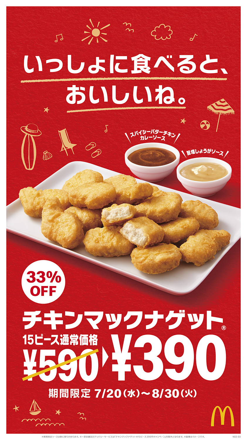 「チキンマックナゲット 15ピース」を夏休み期間に家族や友人とシェアして楽しめるお得なキャンペーンです☆