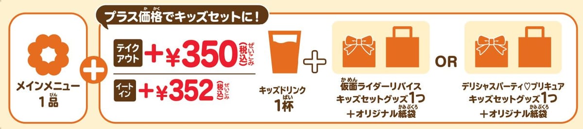 キッズドリンク対象メニュー:バレンシアオレンジ100%ジュース、青森県産ふじりんご100%ジュース、山ぶどうスカッシュ、カルピス、コカ・コーラ、メロンソーダ、アイスウーロンティ、アイスミルク(アイスミルクのみ店内飲食限定)