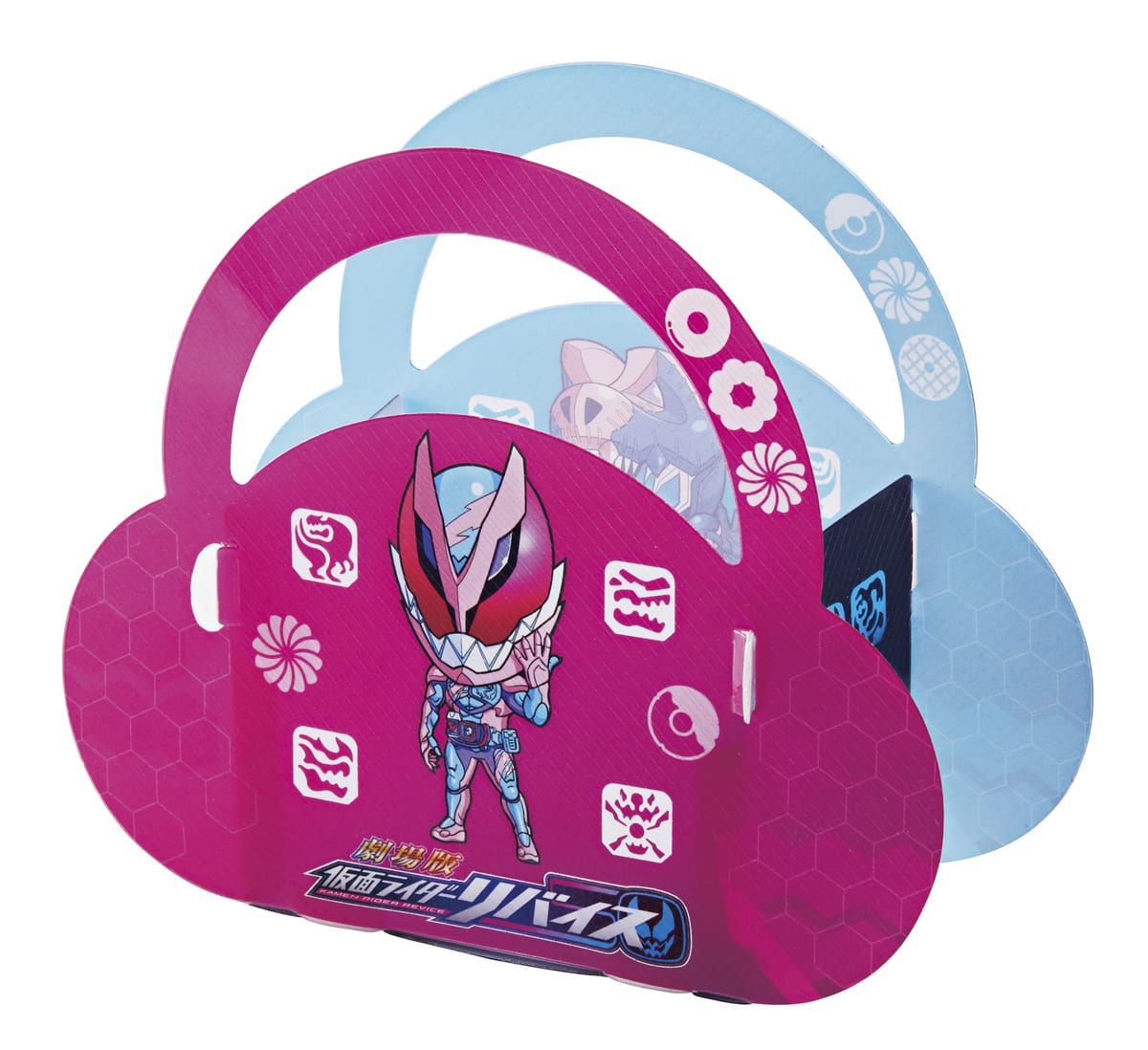 『仮面ライダーリバイス』のくみたてバッグは、「仮面ライダーリバイ」と「仮面ライダーバイス」が表裏にプリントされています。