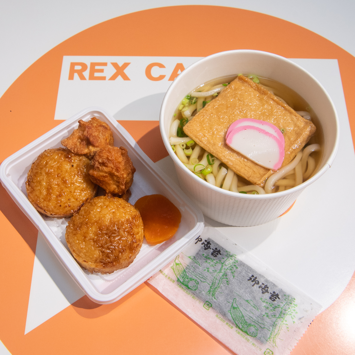 おあげが乗ったきつねうどんと、焼きおにぎり、からあげが一度に楽しめるボリューム感のあるメニュー。