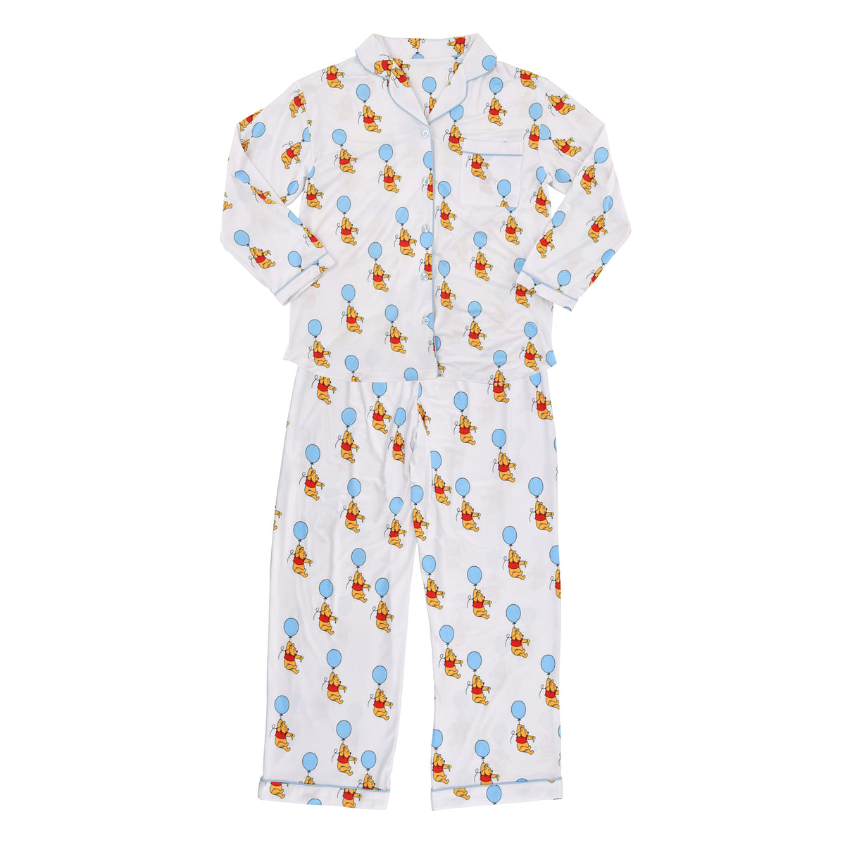 「プーさん」と風船が総柄でプリントされた長袖パジャマ。