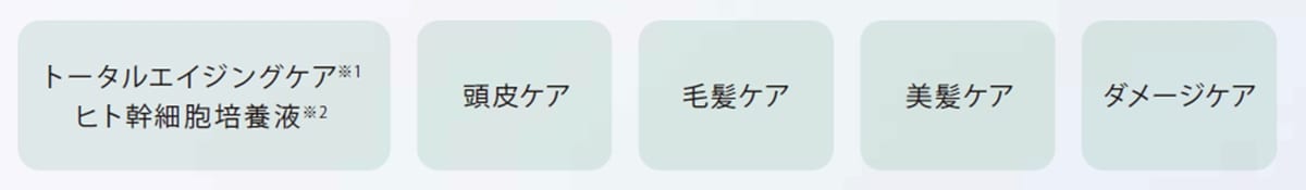 髪と地肌のエイジングケアに欠かせない頭皮ケア・毛髪ケア・美髪ケア・ダメージケアにはたらきかける成分として、贅沢に配合されています。