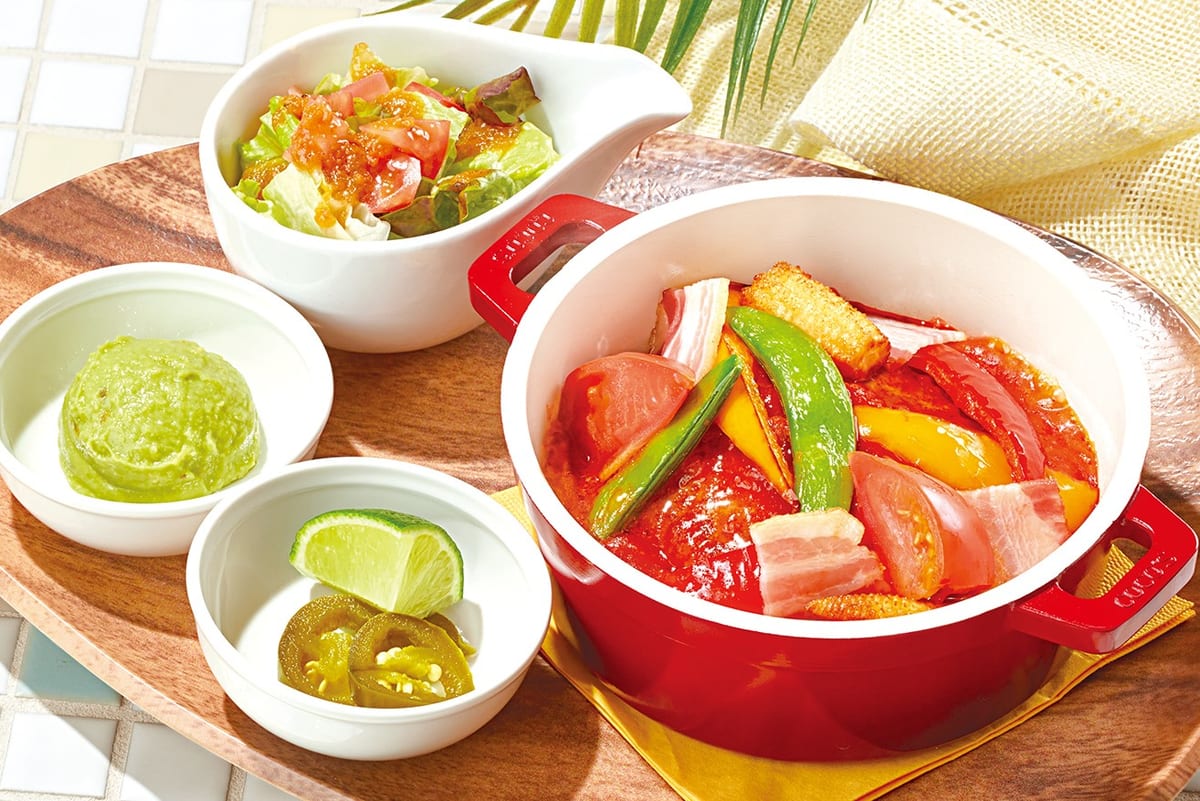 スパイシーで旨みのあるトマトソースが、ジューシーなハンバーグとトマト、パプリカ、スナップエンドウなどの野菜の甘みによく合う「ココットハンバーグ」