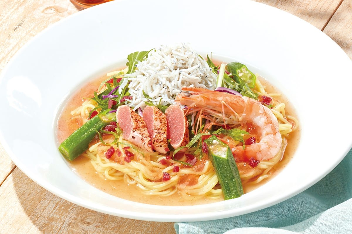 コシのある麺の上に、夏野菜の定番オクラと爽やかな風味の大葉、たっぷりの釜揚げしらすやぷりぷりの有頭エビ、炙りたらこが贅沢に盛り付けられています!