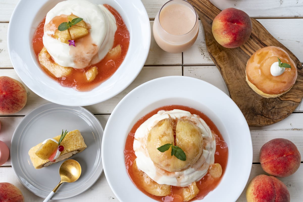旬の桃をふんだんに使った人気のパンケーキやスイーツの期間限定フェア。