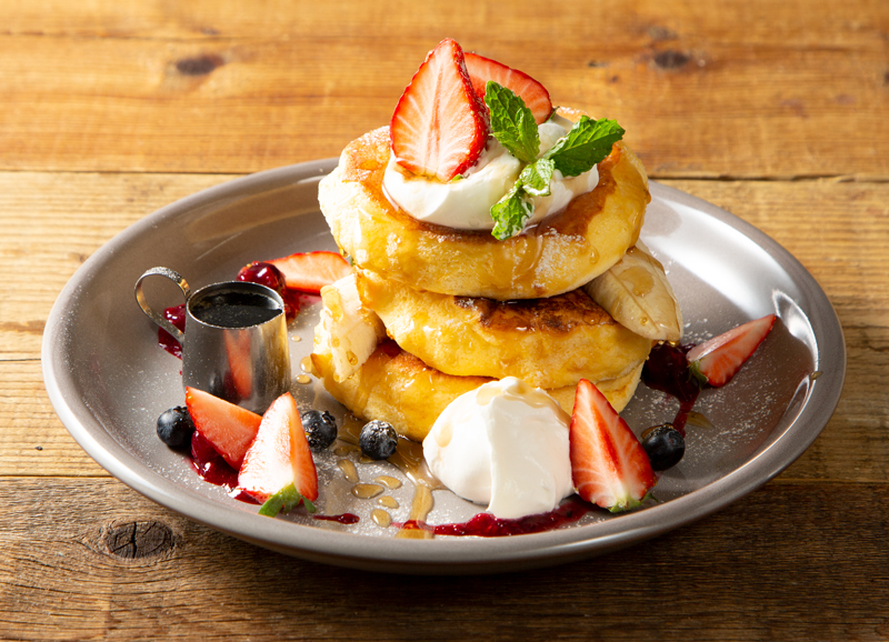 東京産の牛乳で仕上げられたスフレパンケーキ。