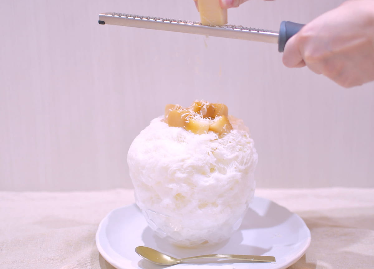 トップにはジャスミンでコンポートした桃が載り、仕上げにグラナパダーノチーズを目の前で掛けてもらって完成する贅沢なかき氷。