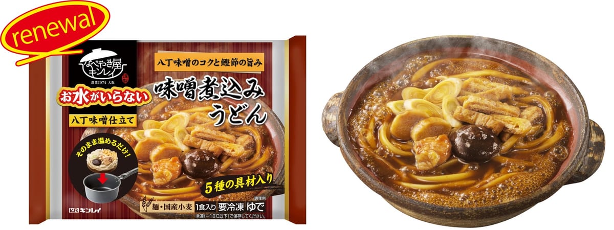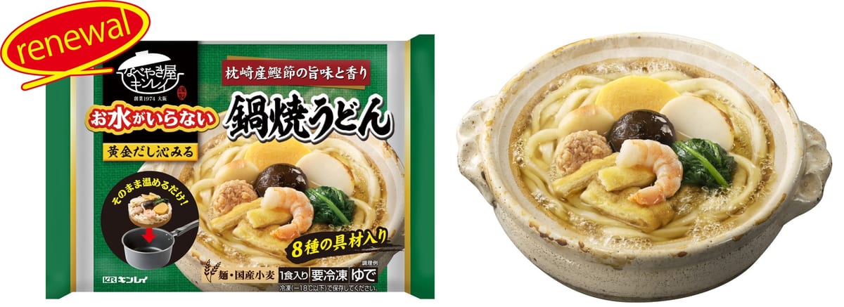 キンレイの定番商品「お水がいらない 鍋焼うどん」「お水がいらない 味噌煮込みうどん」がリニューアル。