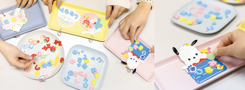 サンリオキャラクターのプレートに、好みのモチーフと文字パーツでお名前プレート作りが楽しめるコーナー。