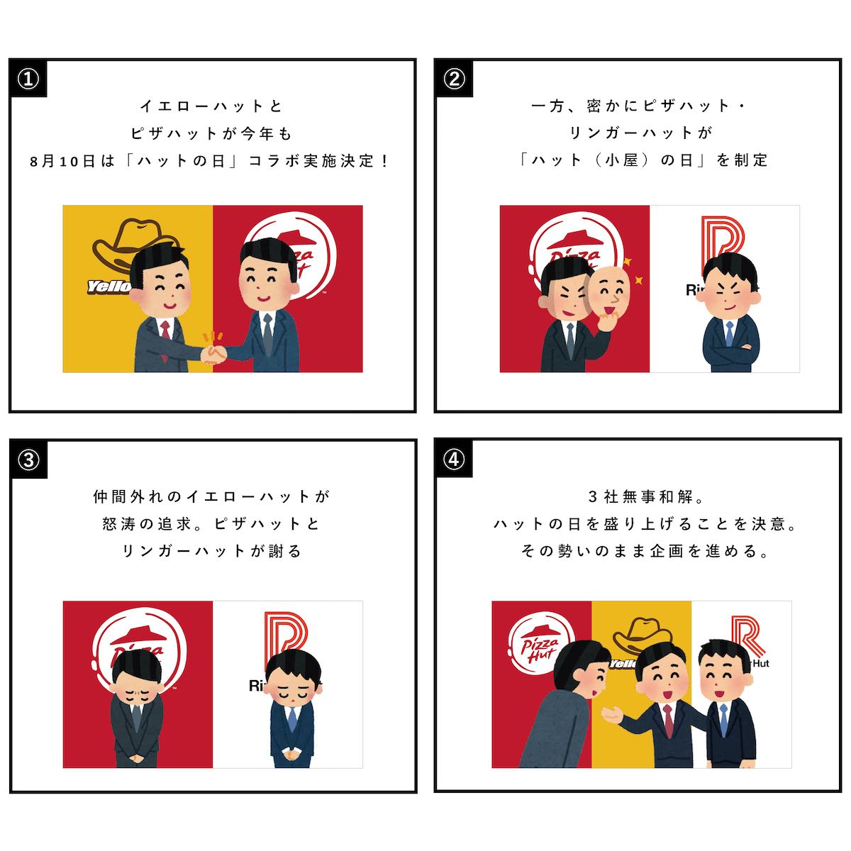 Twitter上での3社のやり取りでは、テンションの上がったイエローハットがフライングでWebサイトを公開したり、リンガーハットがピザハットと2社で記念日登録をしてしまうなど、ハットの日を迎えるまでに様々な出来事はありましたが、最終的に仲直りし、まさかの3社のトップが集まる会議を開催することになりました。