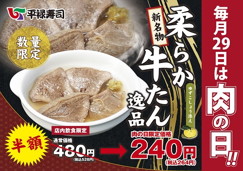 大人気の「柔らか牛たん逸品」は毎月29日(肉の日)には半額の264円(税込)で提供されます☆
