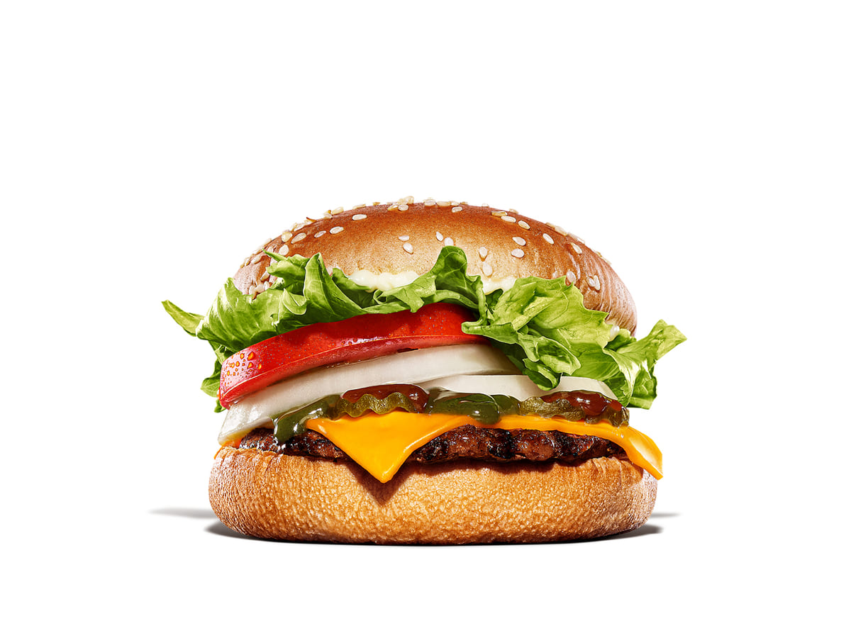 ビーフパティにフレッシュなレタス、トマト、オニオン、ピクルスの豊富な野菜にチェダーチーズスライスが重ねられています。