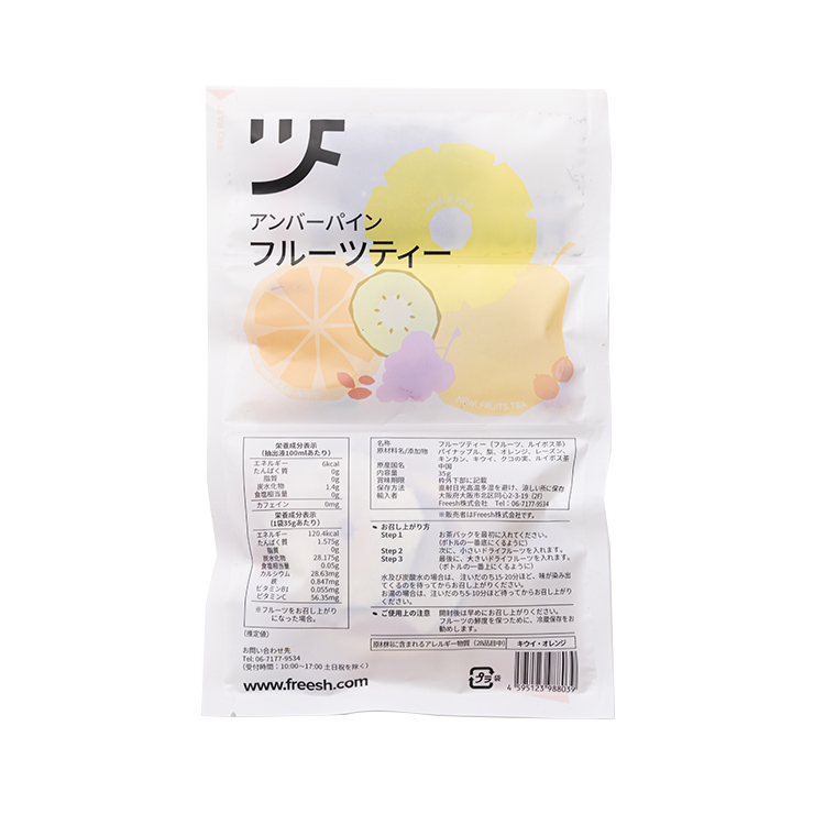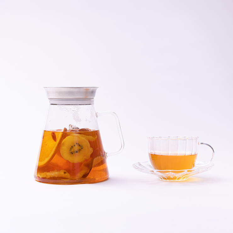 パイナップル、梨、オレンジ、ぶどう、キンカン、キウイ、クコの実の7種の果物とルイボスティーのコラボレーションが楽しめるフルーツティー。