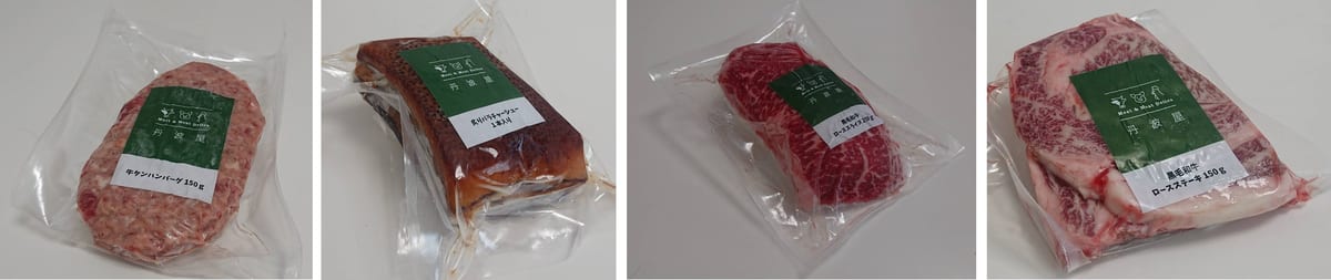 牛タンハンバーグ150g(300円)、三田和牛カルビ焼肉250g(2,000円)、三田和牛バラスライス250g(2,000円)、炙りバラチャーシュー1本(1,000円)、 神戸牛プレミアムハンバーグ130g2個入り(1,000円)、牛すじカレー300g(400円)など合計20商品以上の精肉、お肉惣菜をラインナップ。