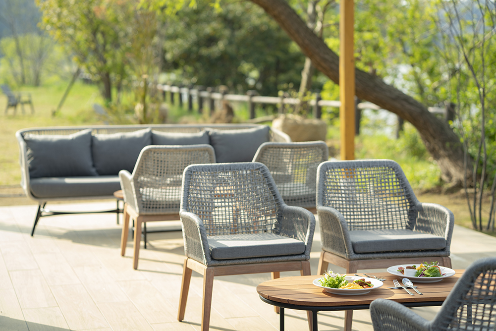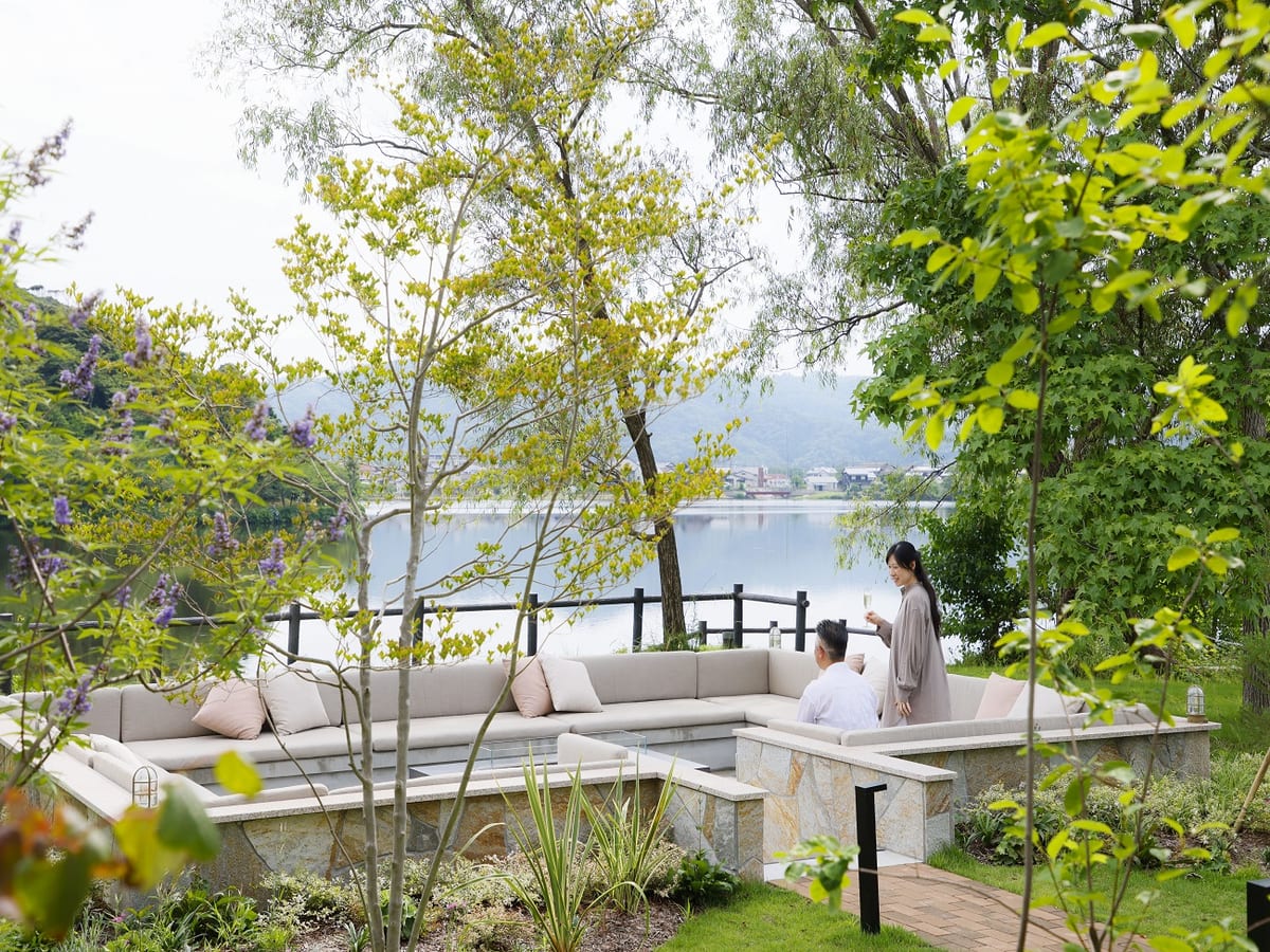 美しいガーデンとその向こうに広がる湖の風景を前に、朝食をお部屋で味わったりヨガでリラックスするなど、より屋外の心地良さを堪能できる設計に。