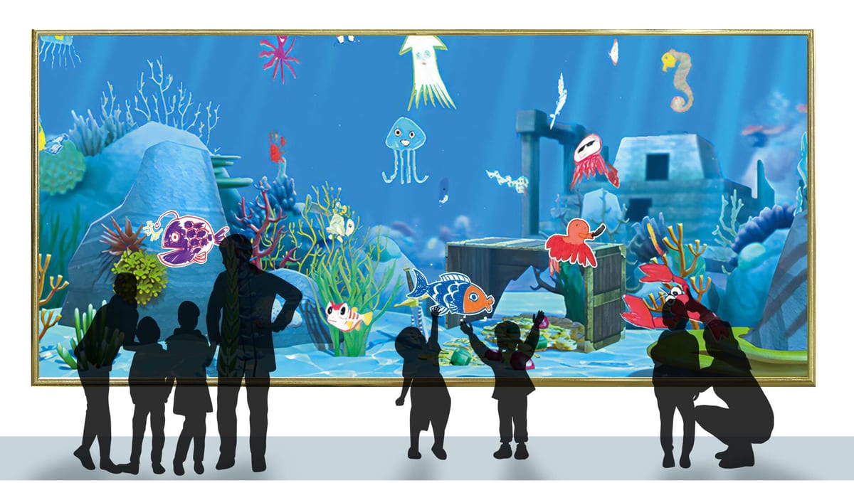 巨大スクリーンの水槽に自分の絵が自由に泳ぎ回る様子が映し出されるとともに、センサーを使ったインタラクション機能により、スクリーンの絵に触れると絵に付けた名前が表示されます。