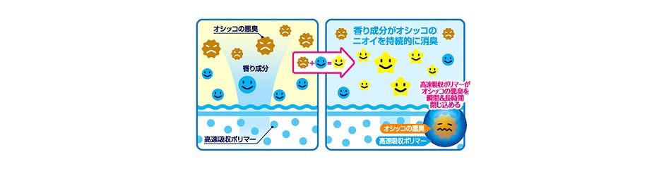 「高速吸収ポリマー」と「ふんわりアロマ成分」のダブル消臭で、瞬間消臭&長時間消臭を実現。