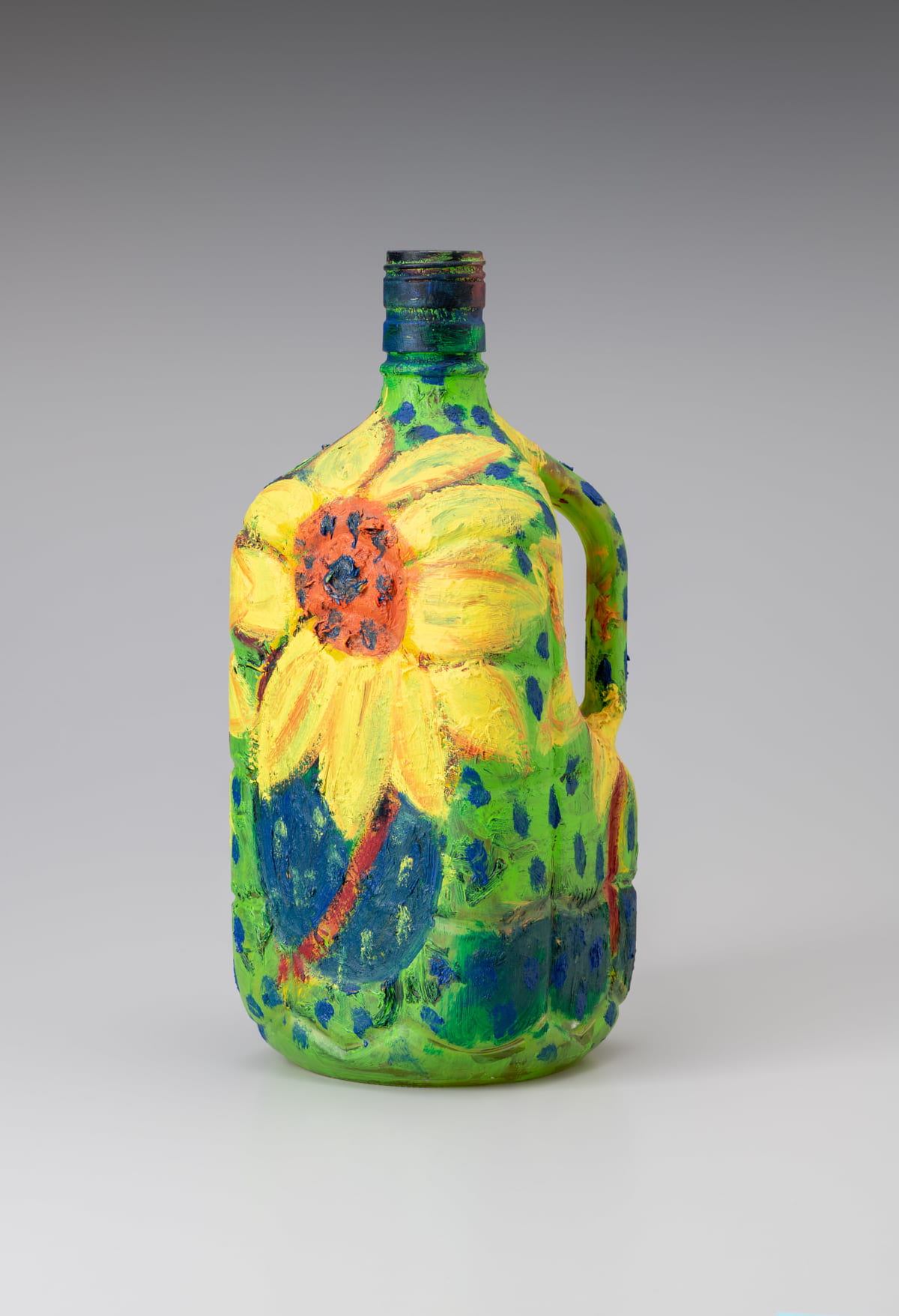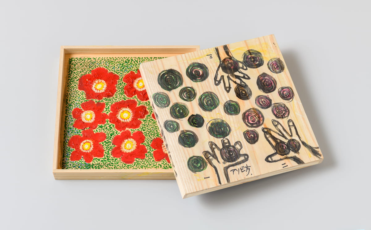 シスコ作品の支持体は、キャンバスやパネルにとどまらず、空き瓶や、木箱、竹筒など多岐にわたります。
