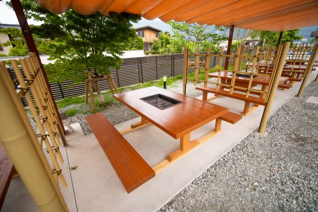 富士を背景に、開放感のあるガーデンエリアで持ち込み自由のセルフバーベキューを楽しむことができます。