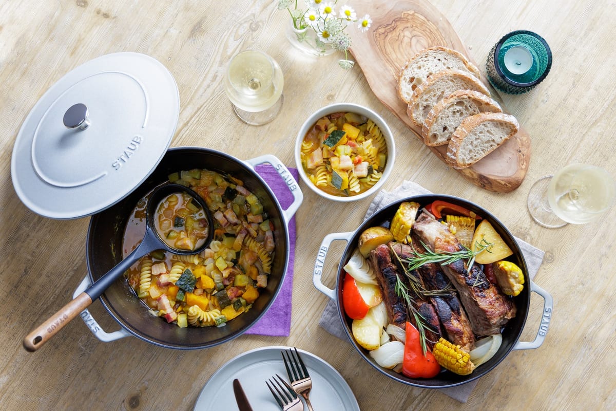 ストウブで人気の「煮込み・無水調理」と、香ばしく焼き上げる「ロースト調理」が楽しめるセットです。