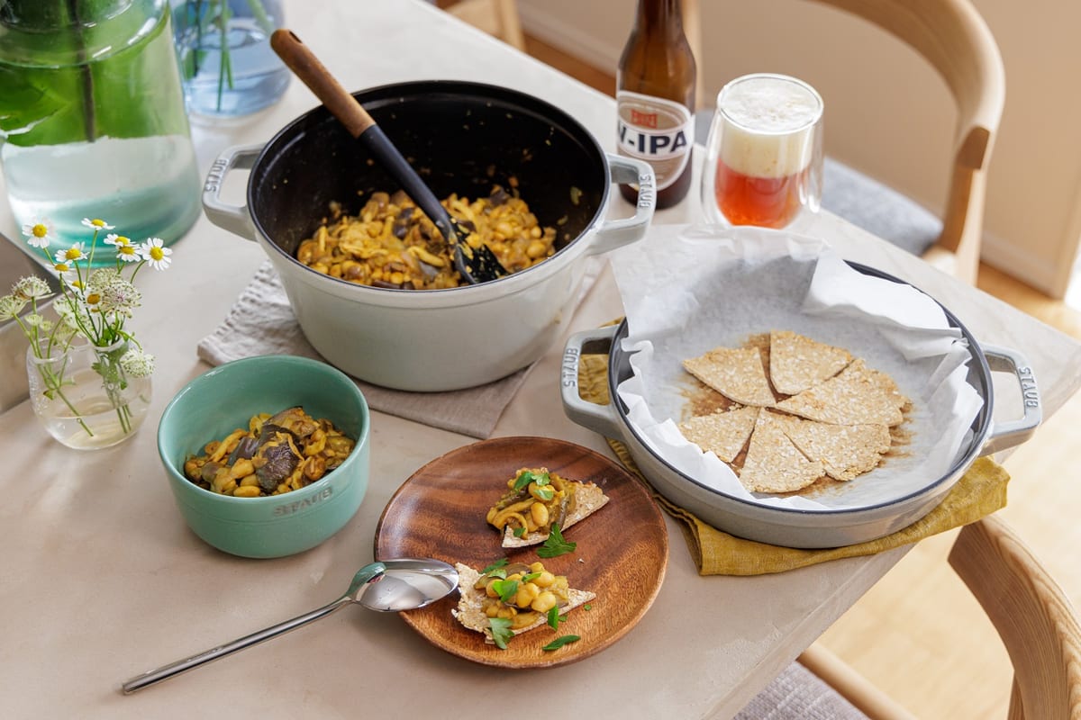 「大豆と茄子のベジカレー」&「オートミールのトルティーヤチップ」2