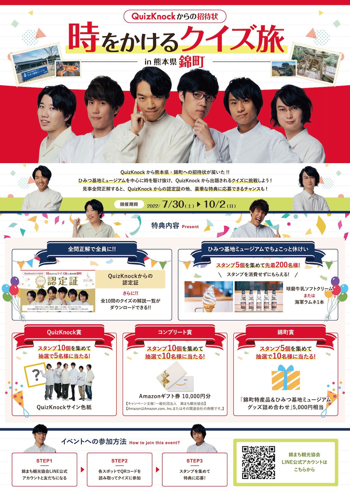 一般社団法人錦まち観光協会は、2022年7月30日から10月2日までの期間「山の中の海軍の町 にしき ひみつ基地ミュージアム」を中心に「QuizKnockからの招待状!時をかけるクイズ旅in 熊本県・錦町」を開催!