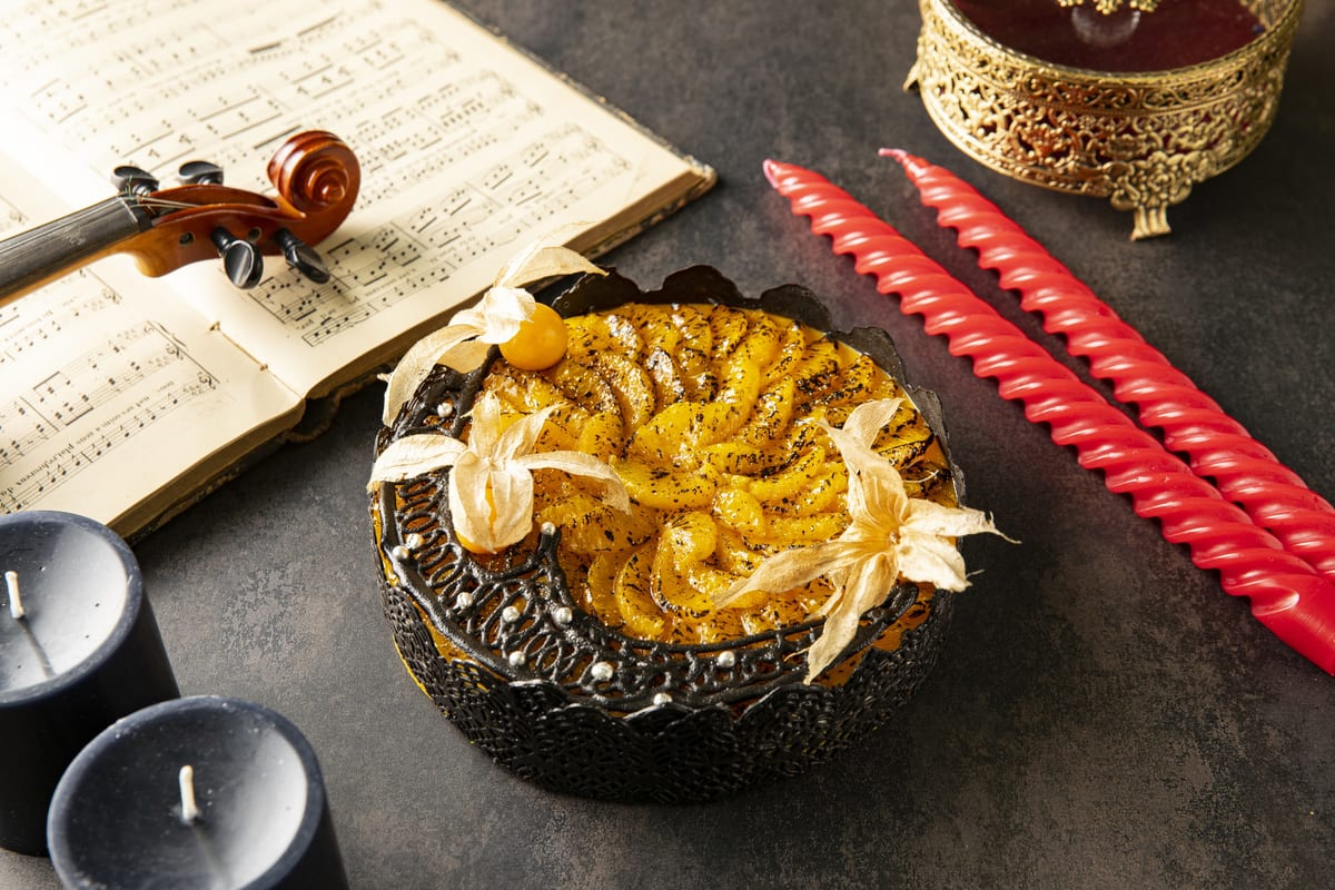トップにはイタリア産マロンクリームで高さのある飾りつけが施され、魔女の帽子を連想させます。