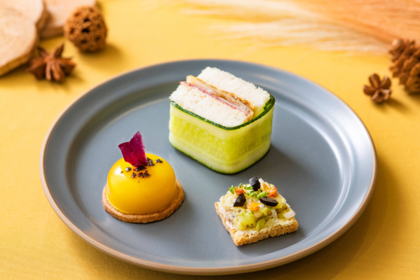 セイボリー「かぼちゃのヴルーテ/ほう葉味噌風味のビーフサンドイッチ/秋ナス“キャビア・ド・オーベルジーヌ”のタルト」