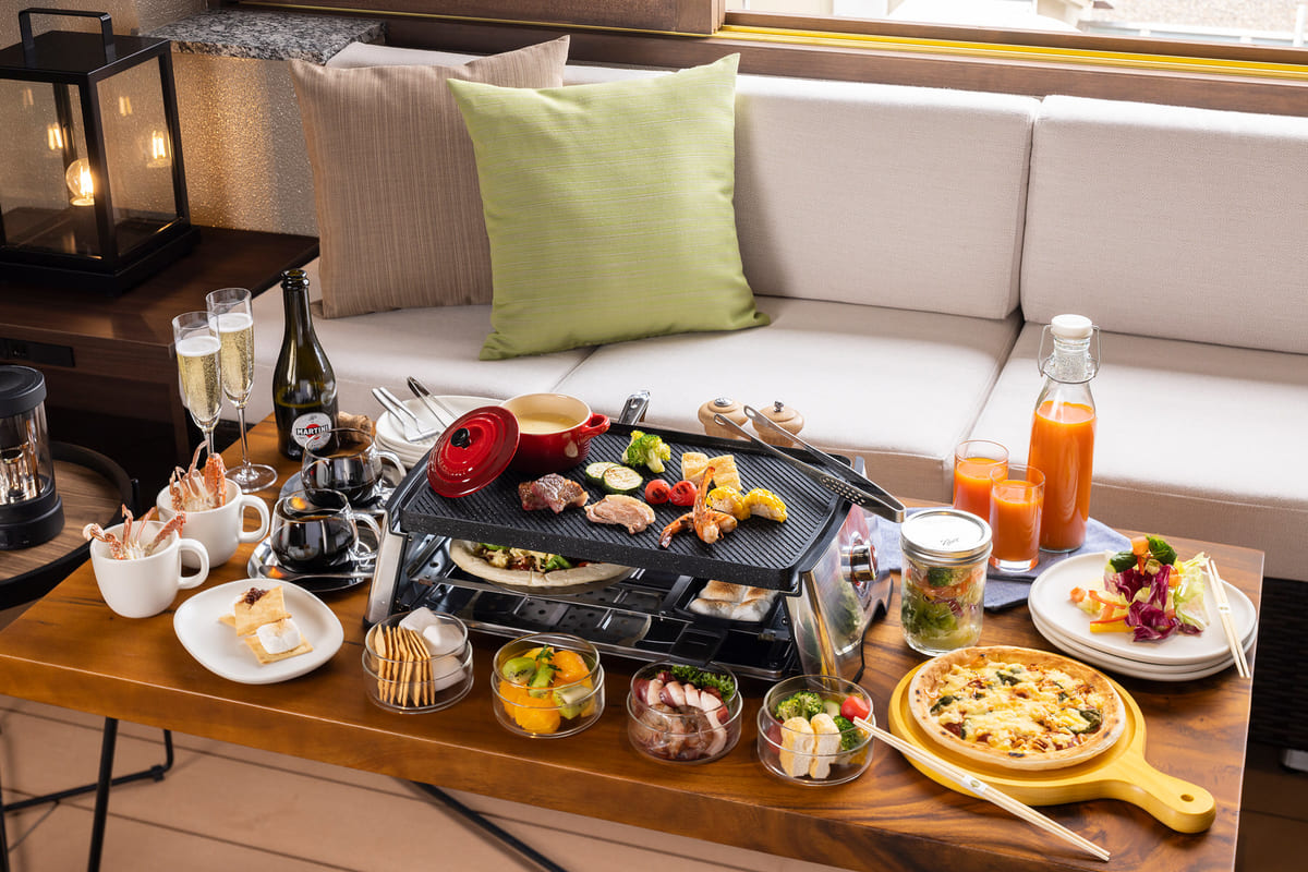 朝食は早朝にお部屋入口横の小窓にベランピング朝食セットを提供し、お好きな時にお部屋のテラスで楽しむことができます。