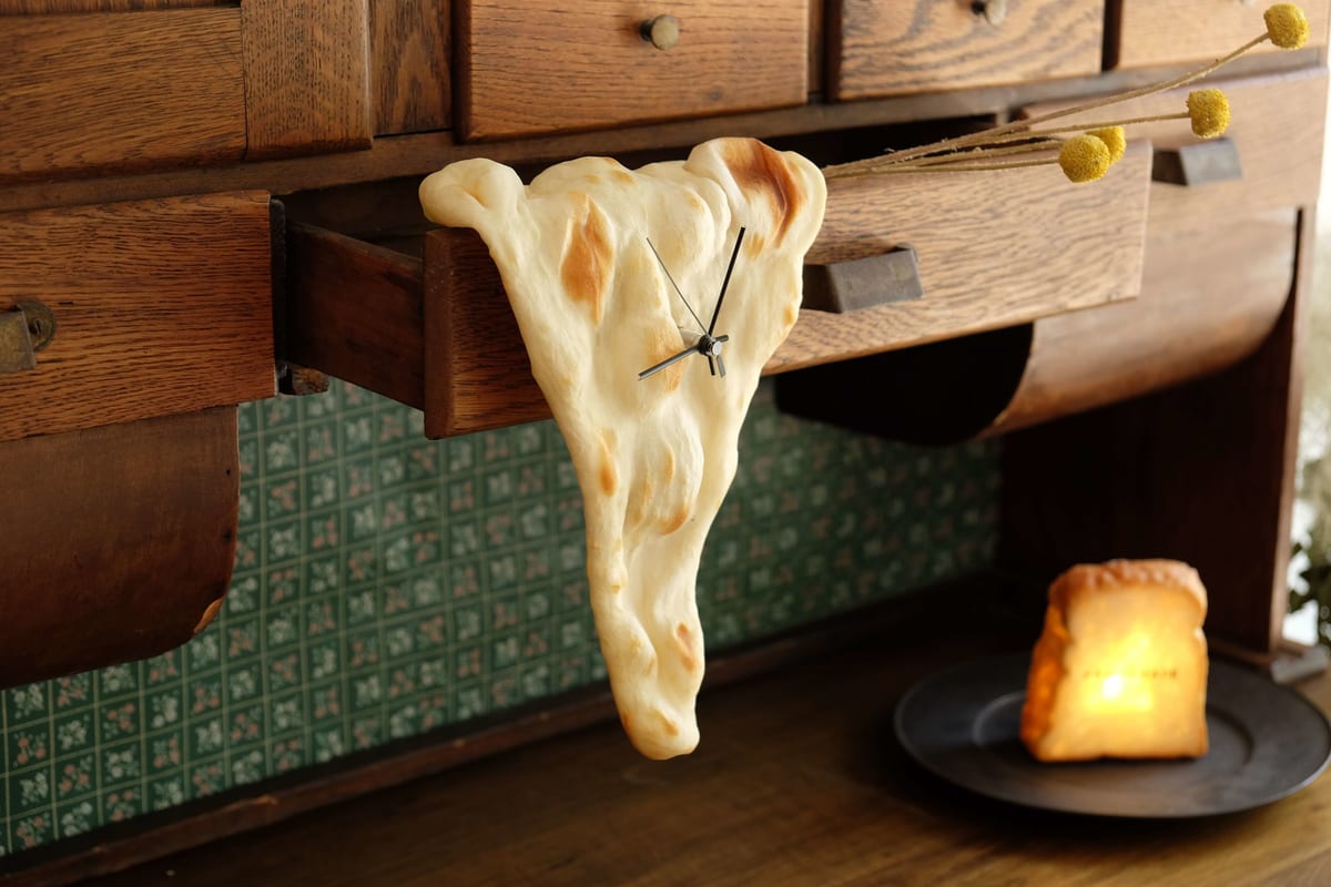 パンにまつわるアート作品を企画・製造するアーティストブランドYUKIKO MORITAから、本物のナンをそのまま特殊な防腐防カビ加工を施した壁掛け時計『今、ナン時(イマ ナンジ)』の新スタイル『“トロける”ナン時』が登場!