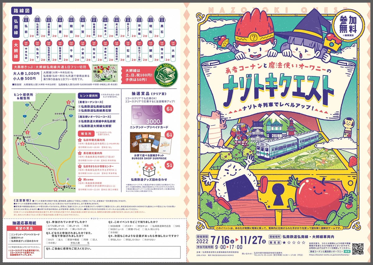 弘南鉄道では、電車に乗って謎解きをする『勇者コーナンと魔法使いオーワニーのナゾトキクエスト』~ナゾトキ列車でレベルアップ!~を、2022年7月16日(土)から11月27日(日)まで開催!