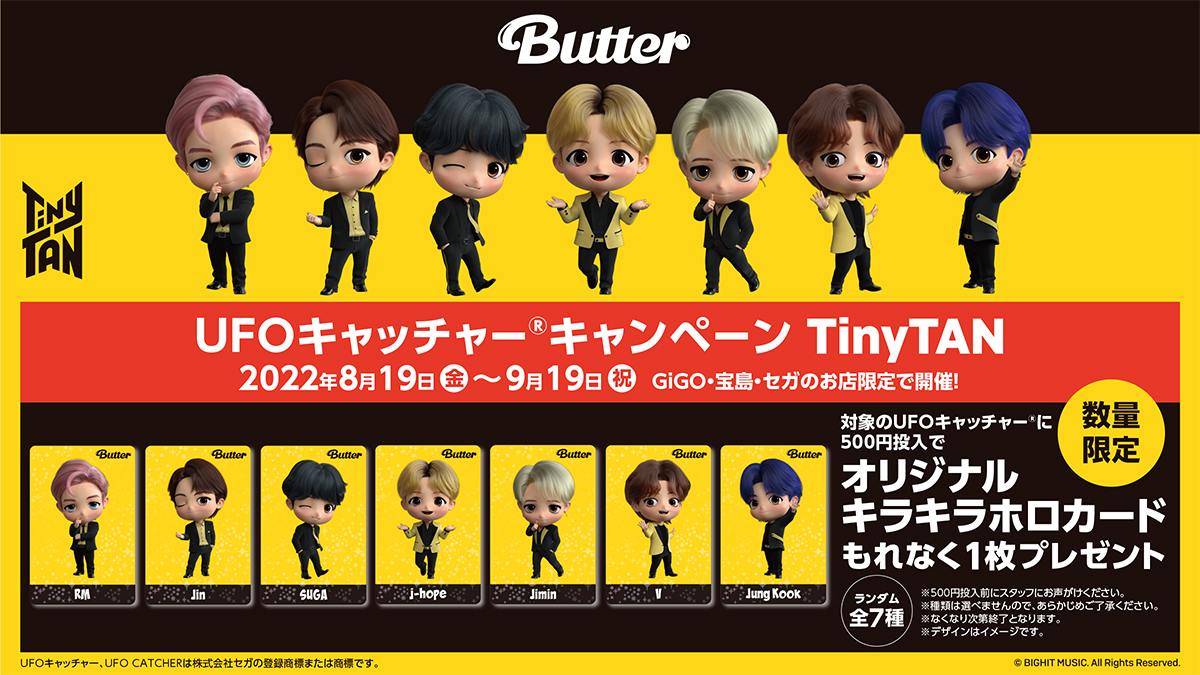 「UFOキャッチャーキャンペーン TinyTAN」は、GiGO/宝島/セガのお店などにて、2022年8月19日(土)から9月19日(月)までの期間限定で開催です!