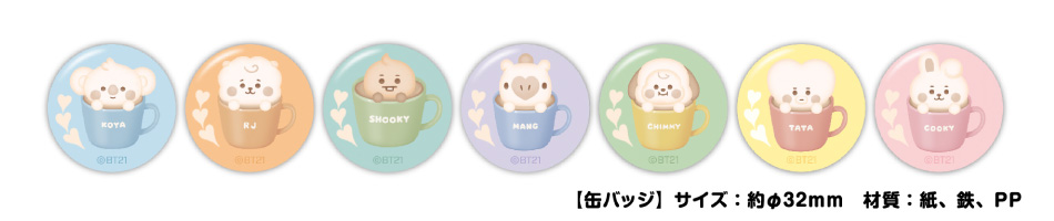 BT21のキャラクターたちがラテアートになったデザインの缶バッジ。