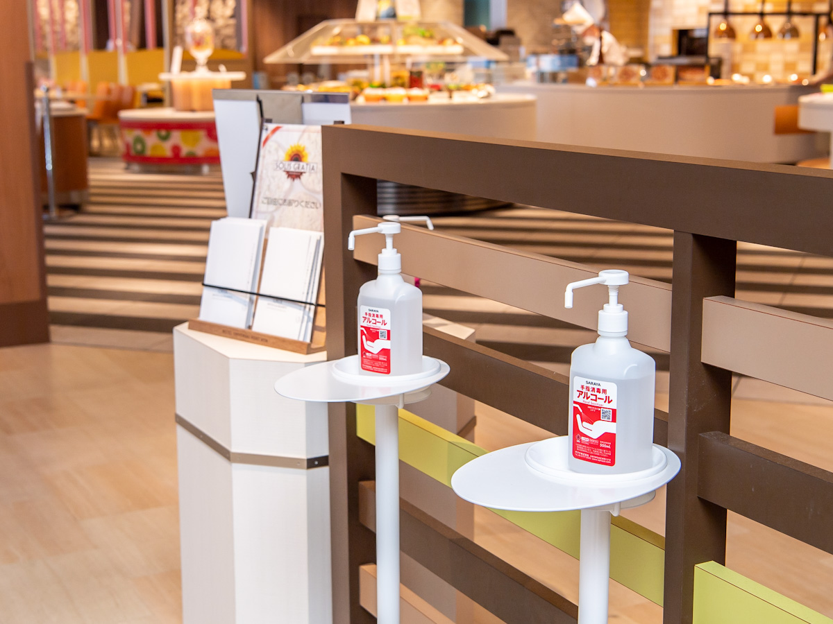「ヴィータダイニング ソリス グラーティア」は、手指消毒のためにレストラン入り口など複数の場所に消毒液を設置、
