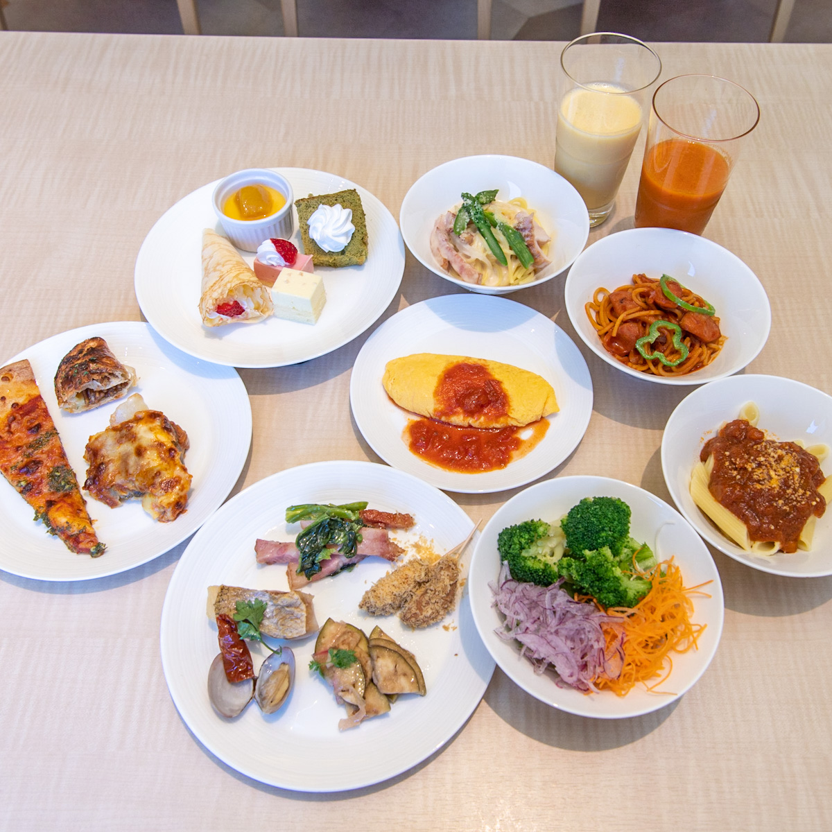 このほかにも、サラダやご飯、カレー、スープ、パンや、お子さまの好きなチキンナゲットや海老フライなどが並ぶキッズメニューコーナー、約25種類のソフトドリンクが楽しめます。