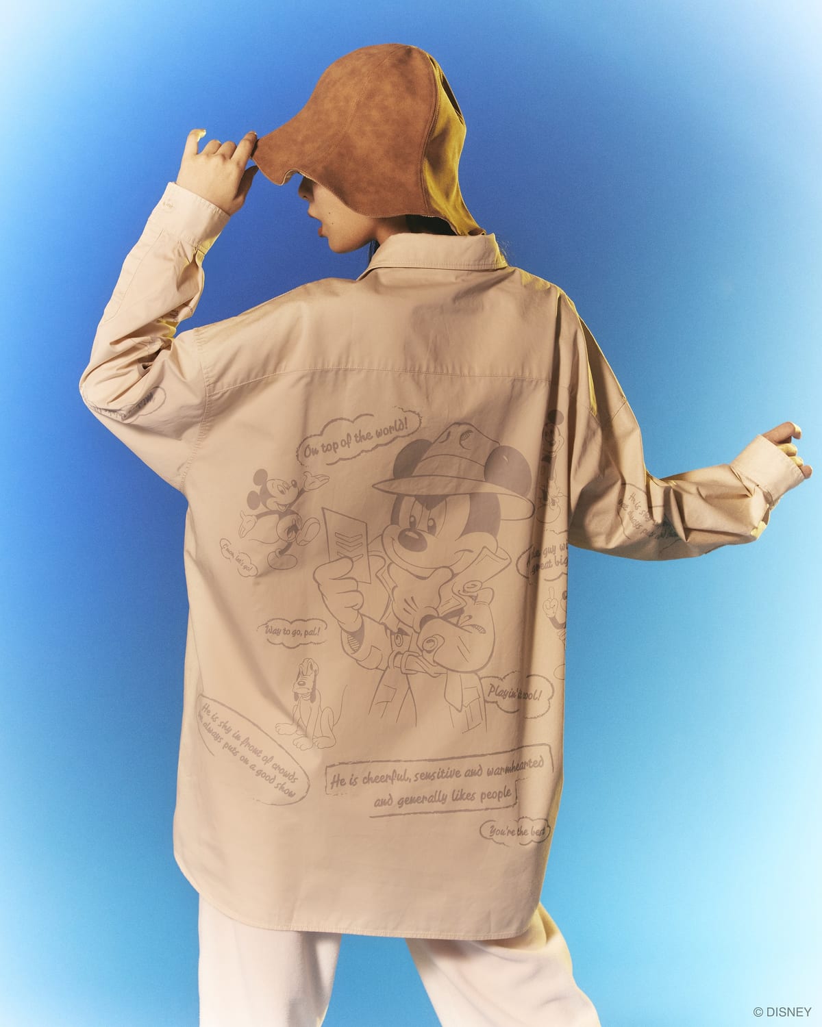 バックに大きくプリントされた探偵風の「ミッキーマウス」がかわいい、ゆったりとしたシルエットのシャツや、