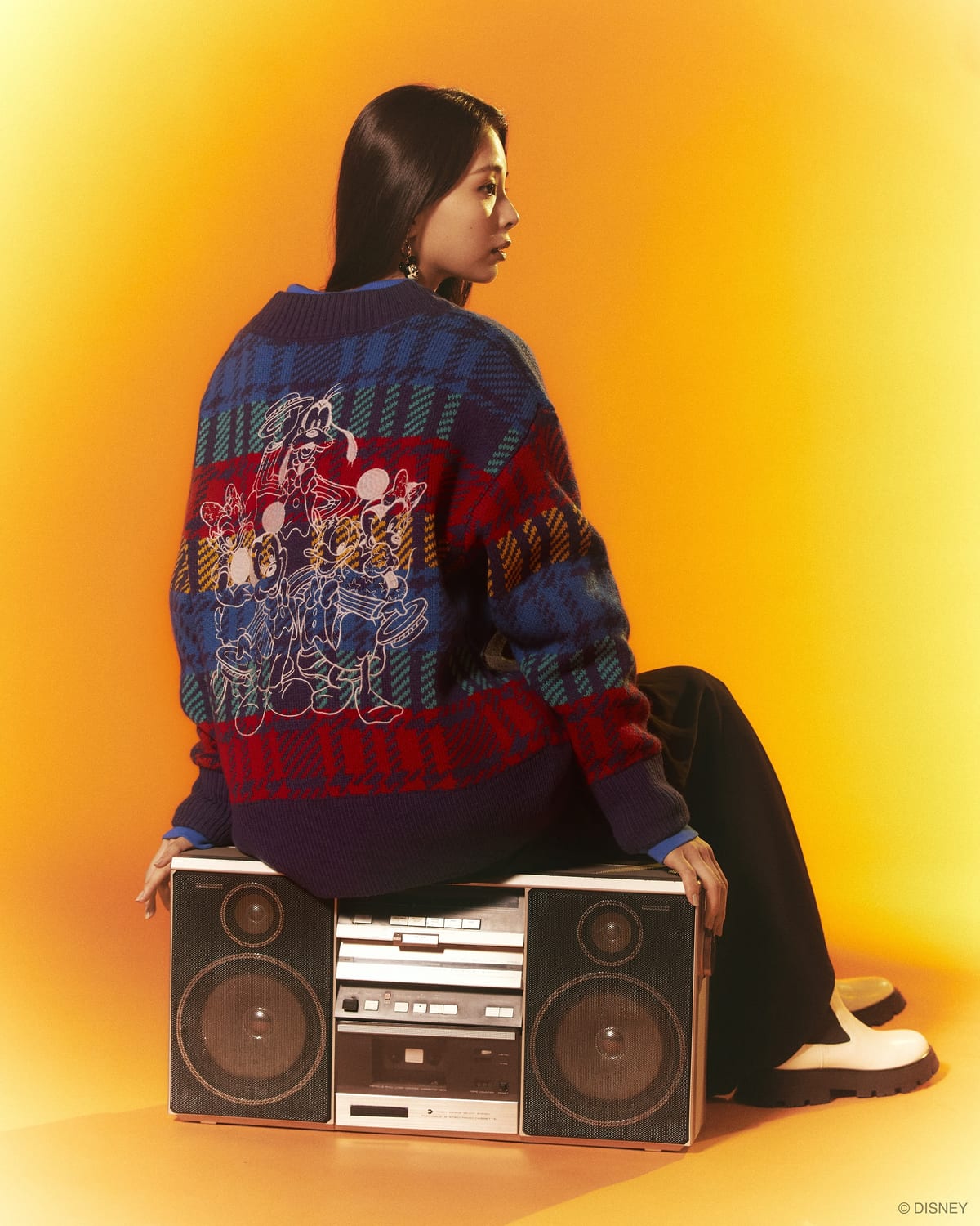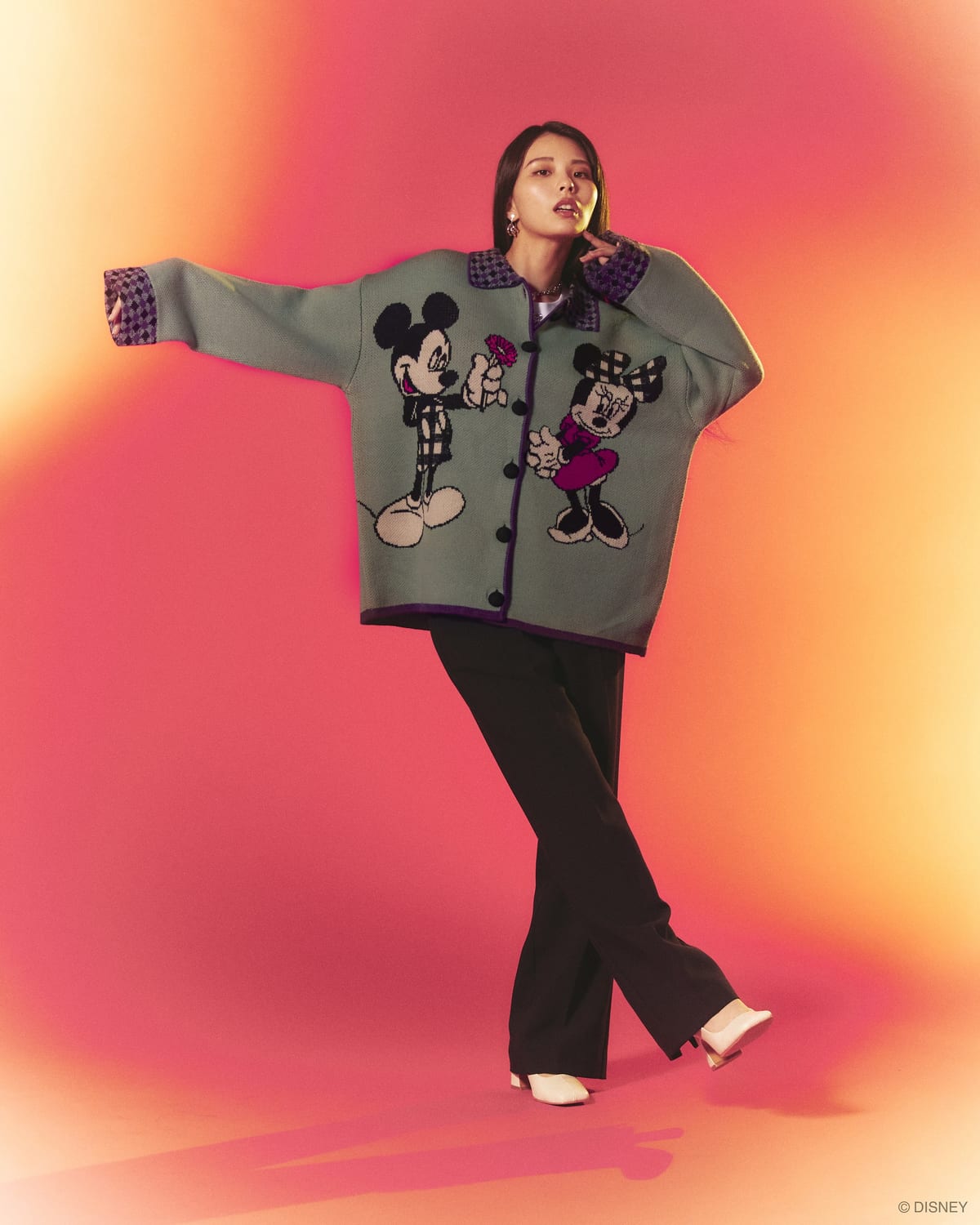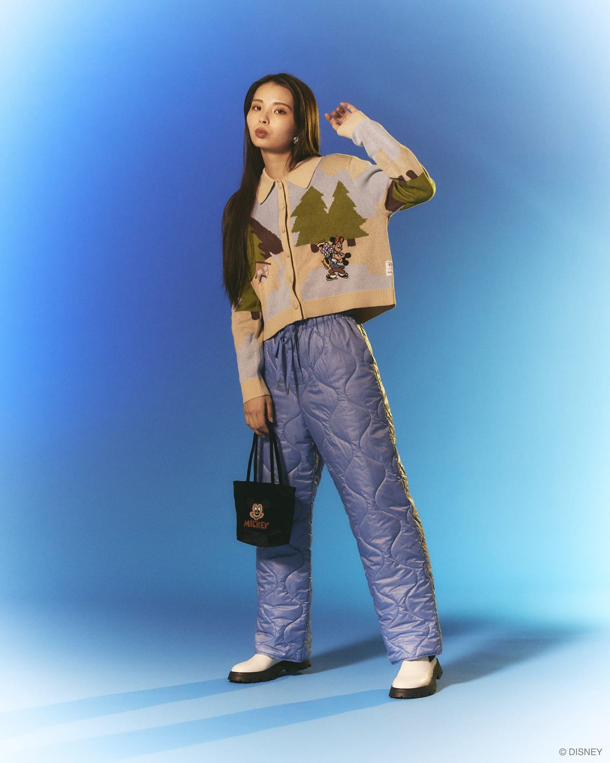 「ミッキーマウス」と「ミニーマウス」が仲良くスケートをしている様子が描かれた、ノスタルジックなデザインのカーディガンも展開。