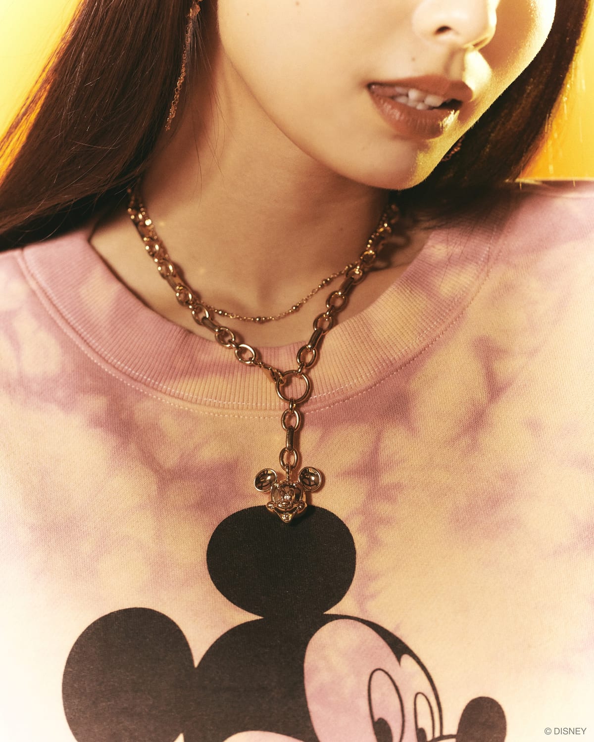 存在感抜群の太めチェーンのネックレスのトップには「ミッキーマウス」のお顔が!