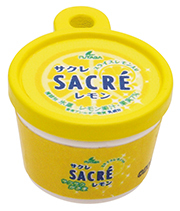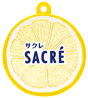 スライスレモンのマスコット1種と、初代~現在までの「サクレレモン」のパッケージデザインを再現したミニチュアマスコット3種のどれかがランダムで入っています。