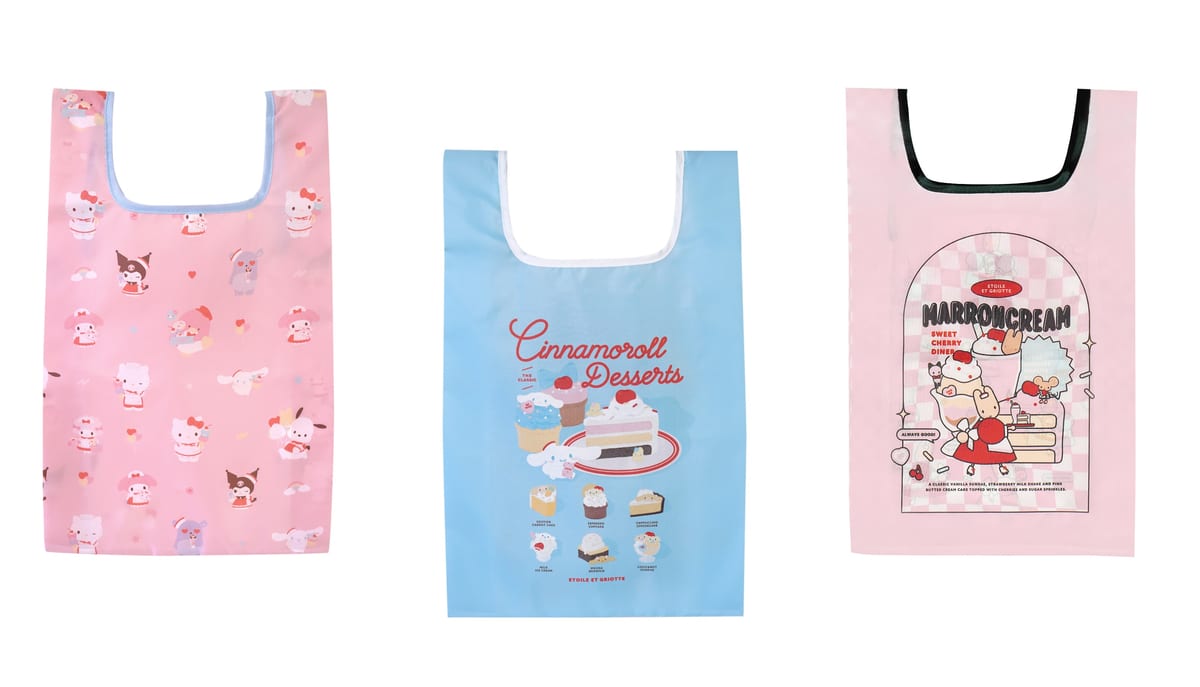 イベントキービジュアルにもなっている”SWEET DAY”シリーズ、今年20周年のシナモロールとのコラボ”Cinnamoroll Desserts”シリーズ、マロンクリームとのコラボ”SWEET CHERRY DINER”シリーズのイラストが描かれたエコバッグ。