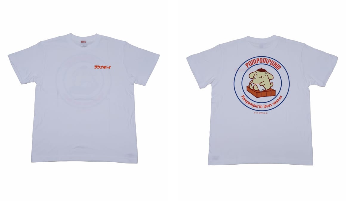 サウナを楽しむ「ポムポムプリン」を描いたTシャツ。