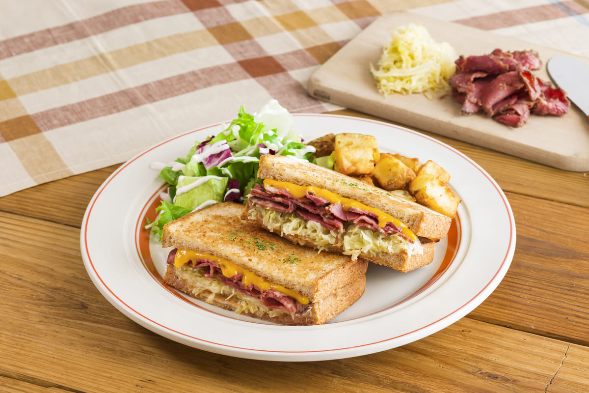 表面をカリッと焼いた全粒粉トーストでたっぷりの具材を挟んだ「パストラミビーフホットサンド」