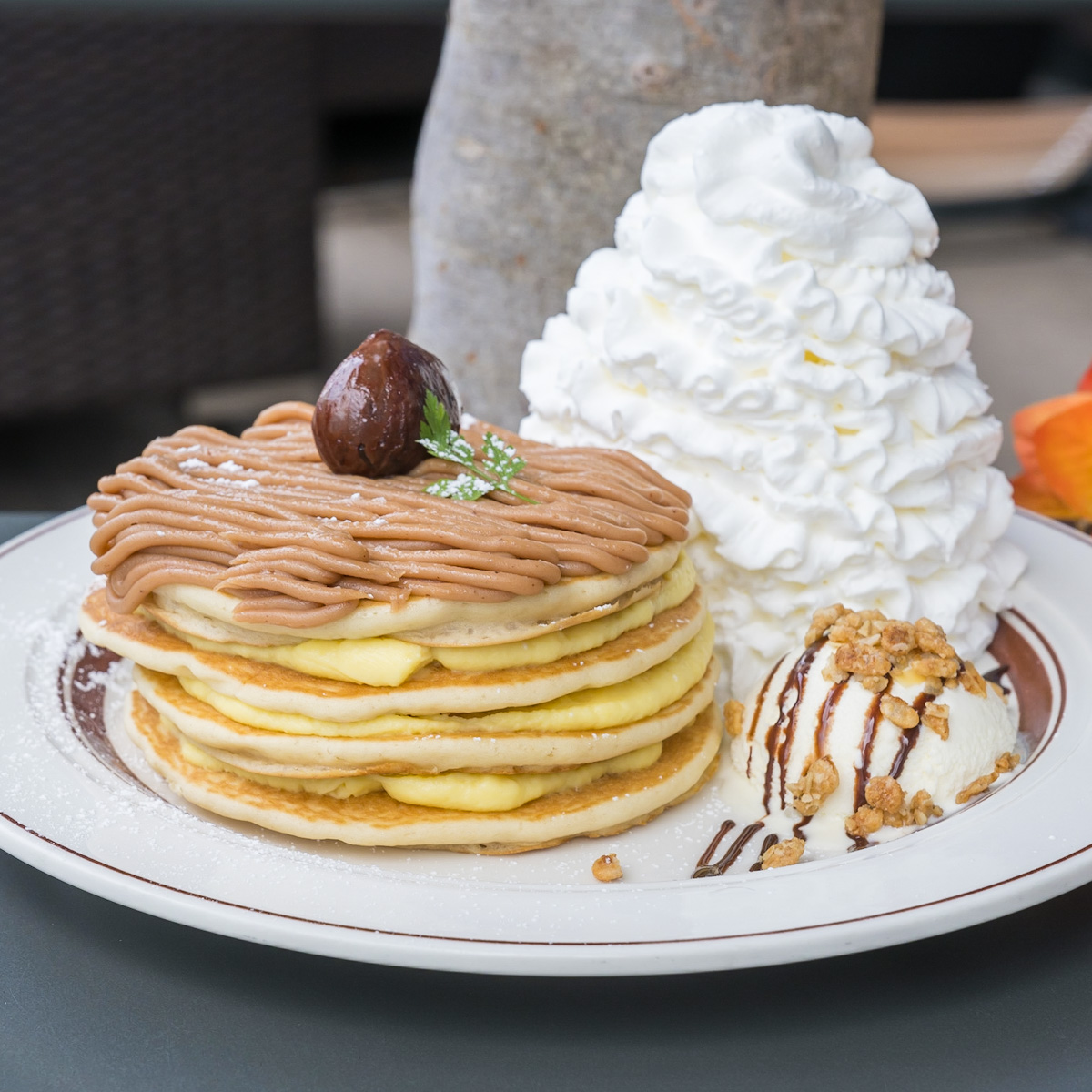 モンブランクリームと一緒にいただくと、こっくり濃厚なパンケーキが楽しめます。