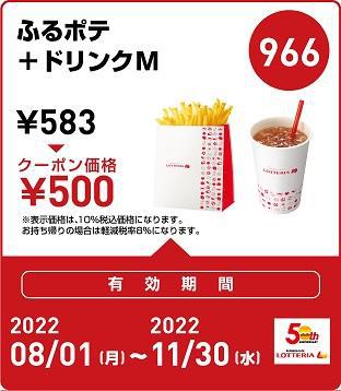 対象商品が「ふるポテ+ドリンク M」のクーポンは、通常価格583円(税込)が、500円(税込)になります。